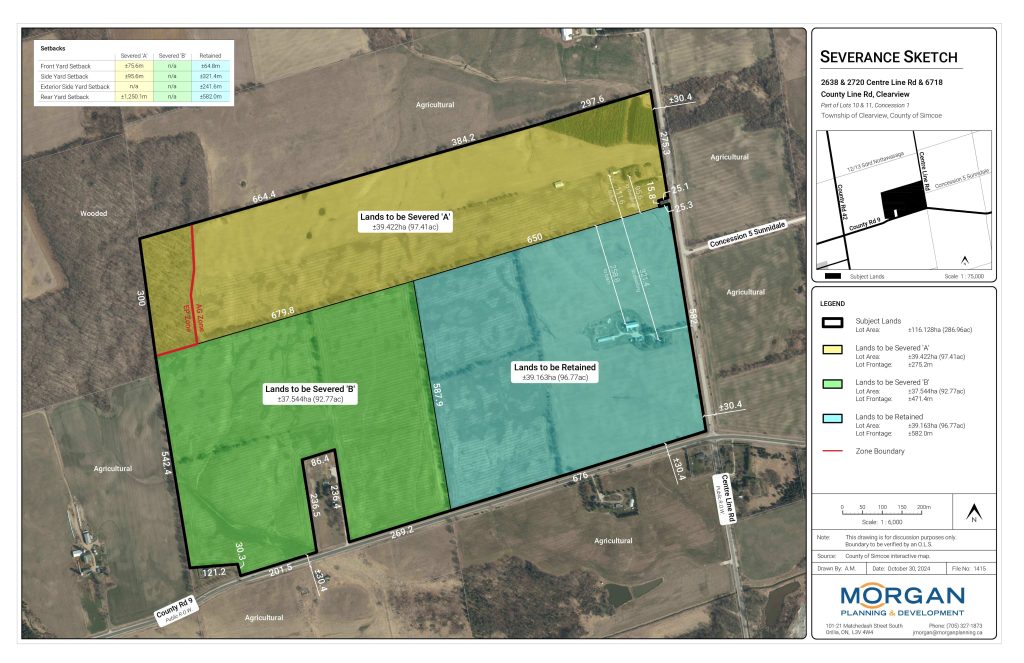 MORGAN Planning & Development submitted Consent Applications for the properties located at 2638 and 2720 Centre Line Road, and 6718 County Line Road to re-establish the historical lot fabric of three agricultural parcels. Over time, the parcels had merged, and the applications facilitated the creation of three separately conveyable properties now recognized as 2720 Centre Line Road, 2638 Centre Line Road, and 6718 County Road 9. Planning services for the project were led by Junior Planner David Scarsellone, BES, Hons. Planning.