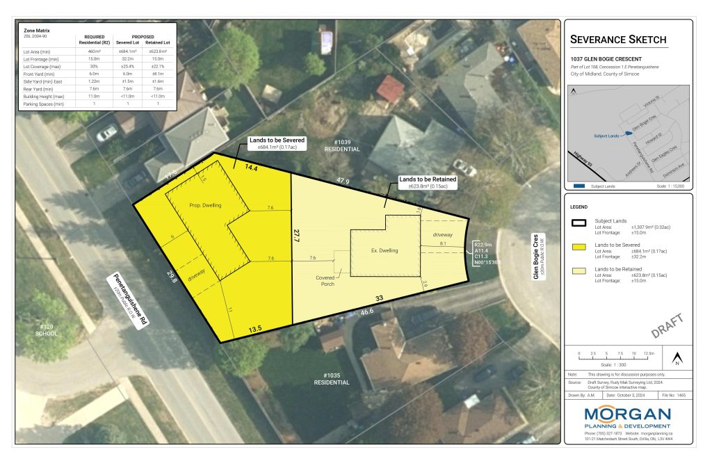 MORGAN Planning & Development acted as both planning consultant and project manager in support of a residential infill severance at 1037 Glen Bogie Crescent in the Town of Midland (PN 1465). The subject property is located within the Town of Midland Settlement Area, and the approved severance permits the creation of a new residential lot to be developed with a single detached dwelling. Planning services for the project were led by Junior Planner David Scarsellone, BES, Hons. Planning.
